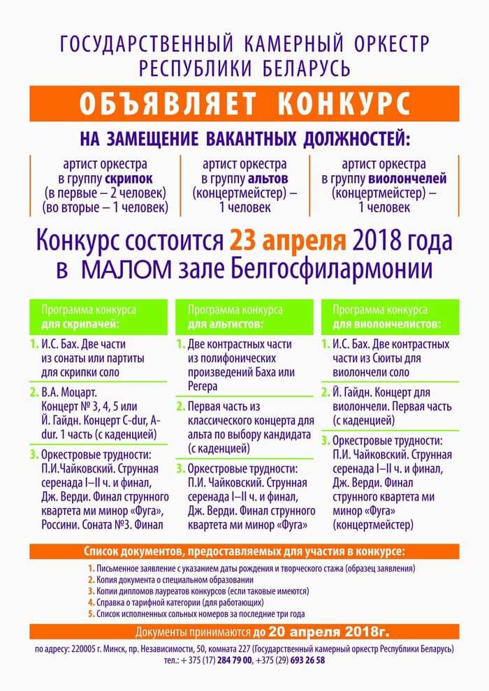 Государственный камерный оркестр объявляет конкурс на замещение вакантных должностей