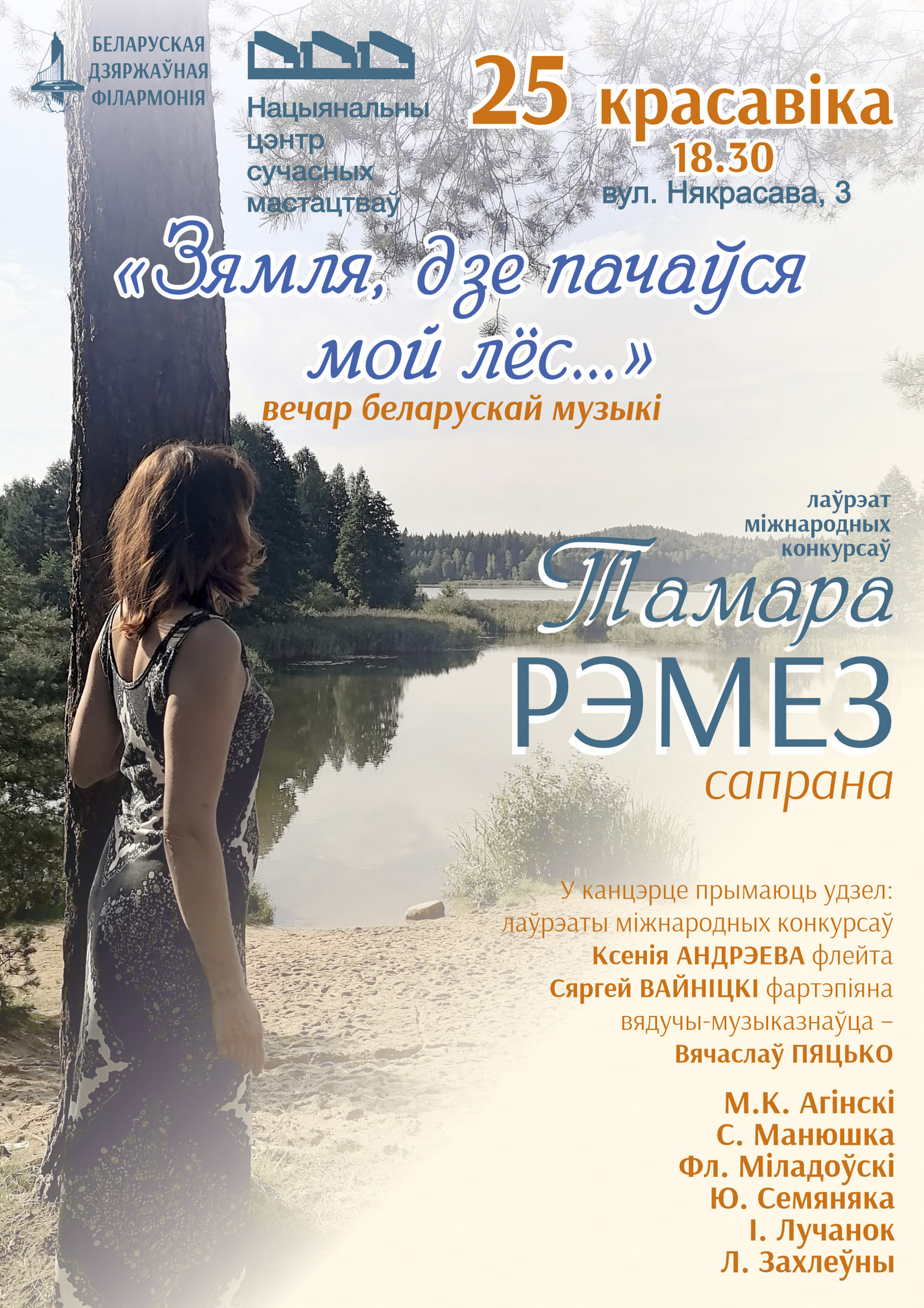 25 красавіка 2025 г. Нацыянальны цэнтр сучасных мастацтваў Рэспублікі Беларусь запрашае на аўтарскі праект лаўрэата міжнародных конкурсаў, салісткі Беларускай дзяржаўнай філармоніі Тамары Рэмез (сапрана) з паэтычнай назвай «Зямля, дзе пачаўся мой лёс…».