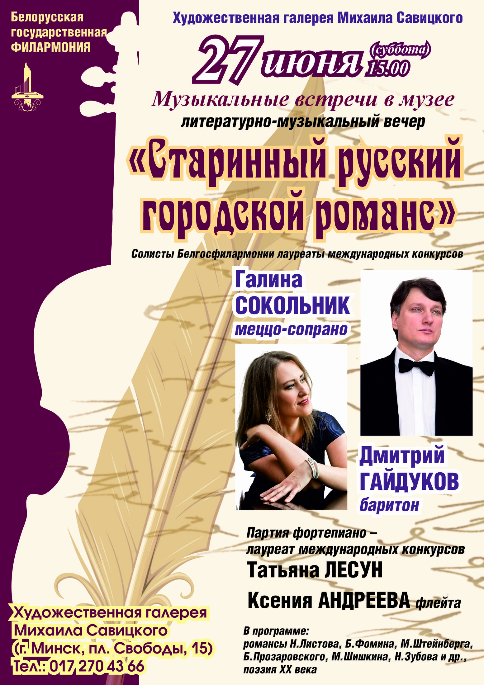 В литературно-музыкальной программе солистов Белорусской государственной филармонии, лауреатов международных конкурсов Галины Сокольник и Дмитрия Гайдукова прозвучат мечтательные, драматические, игривые, чувственные романсы композиторов: Н.Листова, Б.Фомина, М.Штейнберга, Б.Прозаровского, М.Шишкина, Н.Зубова, и других.