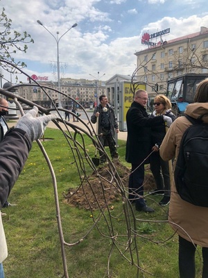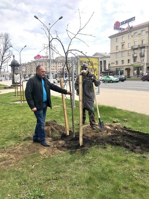 Совместно с Мэрией и администрацией Советского района города Минска посадить деревья на площади Якуба Коласа и убрать прилегающую к филармонии территорию пришли наши сотрудники, не ушедшие в отпуск; их поддержали представители администрации академического ансамбля «Хорошки».
