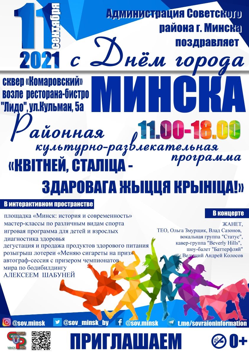 Приглашаем посетить районную культурно-развлекательную программу “Квітней, сталіца – здаровага жыцця крыніца!”, которая состоится 11 сентября 2021 года в 11.00–18.00 (сквер «Комаровский», возле ресторана-бистро «Лидо», ул. Кульман, 5а).